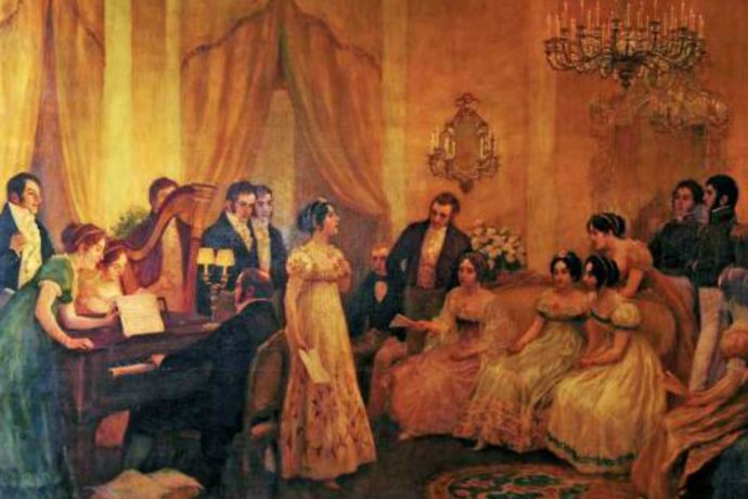 Mariquita Sánchez, además de interpretar la canción patria en su célebre salón literario, donde se realizaban las muy afamadas tertulias. Fue una de las primeras mujeres argentinas políticamente activas.