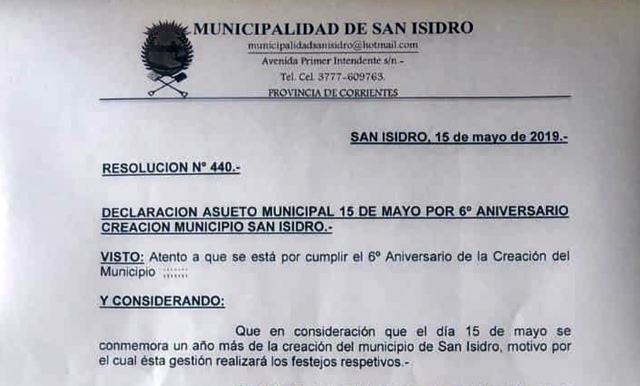 La municipalidad de San Isidro hace saber a su población, que el próximo día miércoles 15 de Mayo ha decretado asueto administrativo, por conmemorarse un año más de su creación.