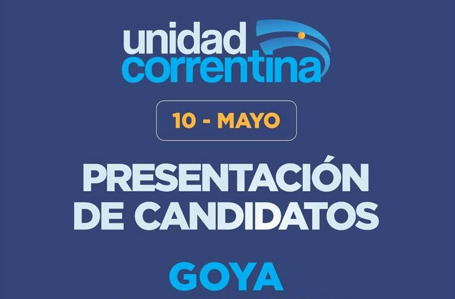 El viernes 10 de mayo se presentaran los candidatos de Unidad Correntina en Goya, la que contara con la presencia de intendentes peronistas, entre ellos Vilma Ojeda de San Isidro, Sananez de Santa Lucia, Hadad de San Roque, Ascua de Paso de los Libre y Garay de Santo Tome. El lugar de la reunión será por calle Belgrano 1061 en el sindicato de SUETRA a las 20 horas. La convocatoria la realizan la línea interna justicialista 17 de Octubre, los partidos Kolina, de la Cultura y el Trabajo, Convocatoria Popular y partido Comunista.