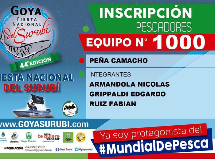 Exactamente a siete días de la noche inaugural, la edición 2019 del considerado Mundial de Pesca logró una marca muy esperada en toda la región. Un equipo representante de la Barra Pesquera "Camacho" integrado por pescadores de Paraná (Entre Ríos) y Río Grande (Tierra del Fuego) tuvo la fortuna de lograr el número 1000 de participación a través del sistema de inscripción online. El próximo viernes 03/05 será la fecha límite para ser parte de la competencia.