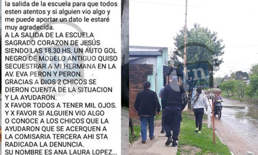 Ayer en horas de la tarde fue viral por redes sociales una noticia donde una familia de apellido López, denunciaba que a una joven estudiante quisieron subirla a la fuerza a un automóvil, cerca del Colegio Secundario Sagrado Corazón de Jesús, zona sur de Goya. Hoy policía en exclusiva confirma a TNGoya el hecho y se investiga para dar con los sospechosos. Hoy las autoridades llevaron a la víctima al lugar donde habría ocurrido todo para que relatara como fue.