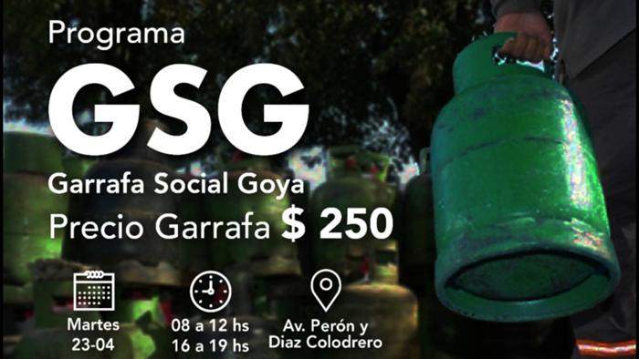 El martes 23 de abril en Avenida Perón y Díaz Colodrero se venderá la garrafa de gas de 10 kilos, del programa Garrafa Social Goya, a $250, oo en los siguientes horarios de 8 a 12 y de 16 a 19 horas.