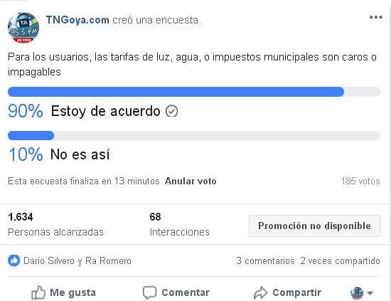 TNGoya realizo una encuesta en la fan page de facebook, donde votaron 185 personas sobre el valor de precios y tarifas. La consulta fue: para los usuarios, las tarifas de luz, agua, o impuestos municipales son caros o impagables. El 90% se manifestó estar a favor con esta afirmación y solo el 10% en contra. En Buenos Aires la misma encuesta arrojo el 70%.