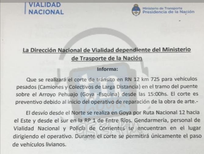 El pasado 25 de enero se interrumpió debido al socavamiento de una alcantarilla en la Ruta Nacional N° 12 a 70 km al sur de Goya, ahora desde las 15 hs, se interrumpe de manera preventiva por trabajos de obra, el paso a camiones y colectivos de larga distancia, informaron las autoridades. Advirtiendo que el desvió desde el norte por dicha ruta es hacia el este y desde el sur Ruta Provincial 1 de Entre Ríos, reza el comunicado de Vialidad Nacional.