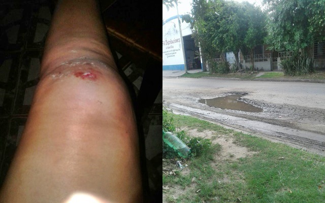 Emilia, una motociclista termino con lesiones en una de sus piernas tras accidentarse por un bache ubicado en Belgrano, entre Sarmiento e Independencia. El gran pozo estaba cubierto por agua, luego de caer fue asistida por vecinos, quienes le manifestaron que no es el primer caso. “Me caigo gracias a eso y mira como quedo mi pierna” relato enfurecida por la situación que debió atravesar.