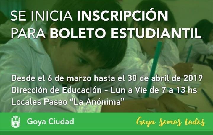 La municipalidad de Goya informa que, a partir del 6 de marzo, cuando comienza el periodo lectivo 2019 en escuela primarias y secundarias, se inicia la inscripción para el Boleto Estudiantil.