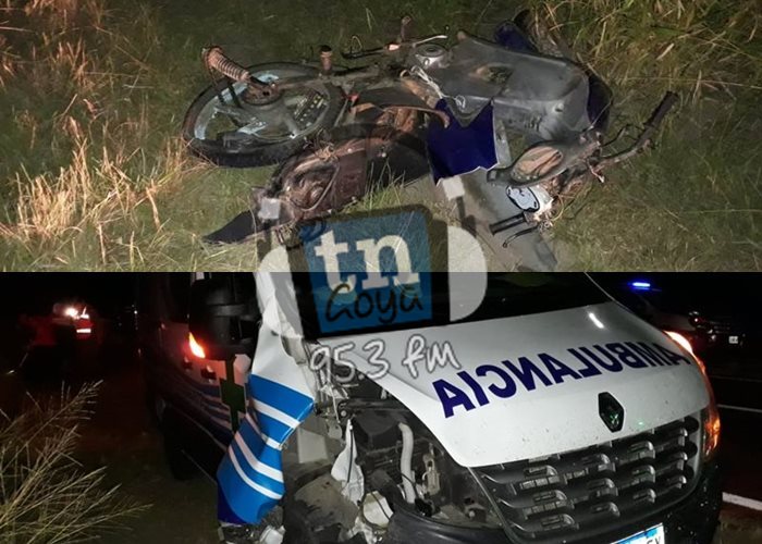 En la noche del miércoles se registró un accidente de tránsito sobre Ruta 12 KM 740, en Paso San Juan, donde una ambulancia de empresa de sepelios de Esquina, impacto de atrás a una motocicleta en la que iba una mujer junto a una bebe, que son oriundas de un paraje cercano, fueron asistidas por Bomberos de nuestra ciudad y se encuentran internadas en el Hospital Regional. IMAGENES