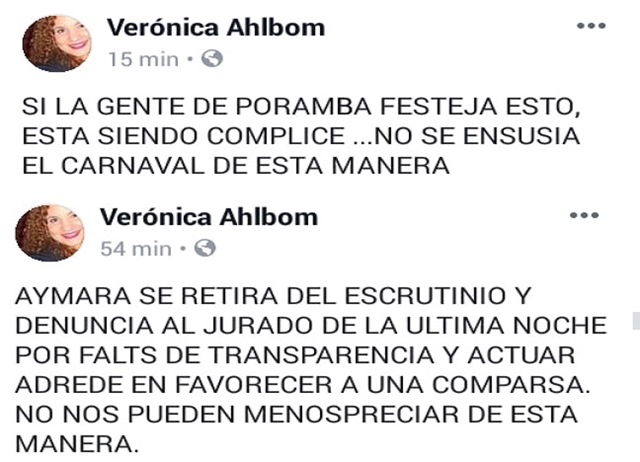 En horas de la mañana se generó un escándalo en el ambiente carnestolendo de Goya, hoy se conocía los escrutinios y al saber algunos puntajes, genero revuelo. Verónica Ahlbom, hizo público su descontento con el jurado del MOMO 19, haciendo alusión que, de la última noche hubo falta de transparencia y actuaron adrede en favorecer a una comparsa. Y arremetió que si Poramba festejaba los puntos, está siendo cómplice y ensucian el carnaval. Además anuncio que comparsa Aymara se retiraba de los escrutinios. “Se debe anular la votación de los jurados de la última noche, presentaré testimonios y evidencias” sentencio