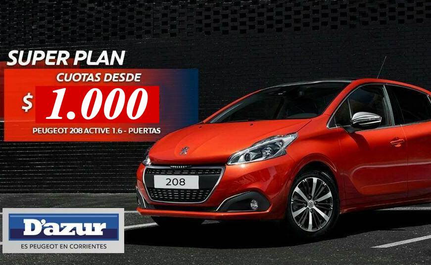 Dazur peugeot te da la posibilidad de tener tu 0 km con un SUPER PLAN %100 FINANCIADO, el único con cuotas al alcance de tu bolsillo. Sin tener que pasar por banco o financieras. Hoy llegar a ese 0 km es mucho mas fácil de lo que pensas. Arranca con $1.000 y veni a concocer nuestra nueva sucursal y obtene mas beneficios, no podes dejar pasar esta oportunidad. Si querés mas información envianos un SMS o un whatsapp al 3794651455 y un asesor se comunicara con vos.