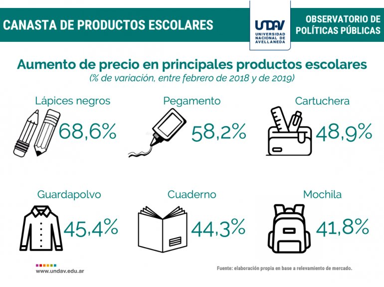 Un informe del Observatorio de Políticas Públicas de la Universidad Nacional de Avellaneda (UNDAV), dio cuenta del brutal aumento que sufrieron los útiles escolares desde que asumió Cambiemos. Las consecuencias del proceso inflacionario que padece la Argentina se vieron ampliamente reflejadas en la canasta básica de productos escolares, que subió 206% en tres años.