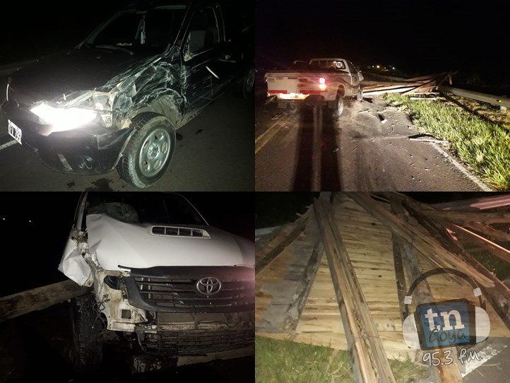 En la noche del viernes, una camioneta Chevrolet, que tiraba un tráiler con maderas y postes termino ocasionado accidente que pudo ser grave. Se desplazaba hacia zona de Goya, y en la subida del puente Santa Lucia jurisdicción Lavalle, cae parte de la carga e impacta una camioneta Toyota Hilux que termina destruida la parte delantera, también un vehículo marca Ford Ecosport, recibe daños y el conductor resultó lesionado.