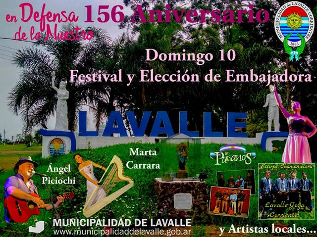 La municipalidad de Lavalle invita a todos los Goyanos para participar de las actividades previstas para el mes de febrero. El lunes 4 comienzan los eventos para la "Semana del Pueblo" en el marco del 156° Aniversario de la Fundación de Lavalle. El día domingo 10 es el Acto Central y el Festival con Elección de Embajadora. El sábado 9 comienzan los Carnavales y el mismo contará con 3 noches más los días 16, 17 y 23 de febrero.