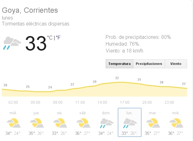 El extendido del clima para la ciudad de Goya es poco alentador para fin de año, ya que hay probabilidad de lluvia para los días domingo y lunes, con temperaturas que irán desde los 24º de mínima y 35º de máxima. Para el 1 de enero se presenta parcialmente nublado con una mínima de 27º, una máxima de 35º y una sensación térmica que oscilara en los 39º. Para toda la semana se espera mucho sol.