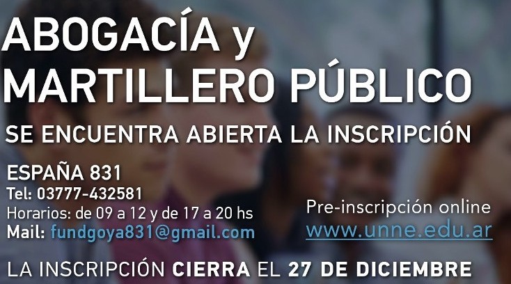 Inscripción abierta para las carreras: Abogacía y Martillero Público. Mas informacion en España 831 teléfono 03777-43581 horario de 9 a 12 y de 17 a 20 horas pre-inscripción online www.unne.edu.ar. La inscripción cierra el 27 de diciembre