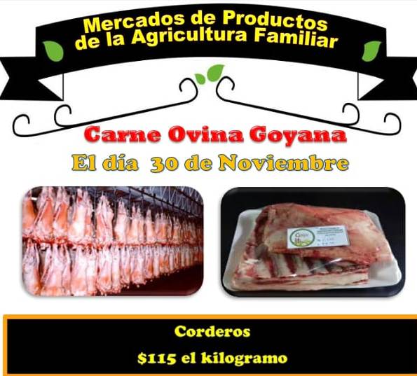 El viernes 30 de noviembre en Plaza Mitre, desde las 8 hs se ofrecerá cortes de carne ovina goyana a $ 115 el Kilo, junto a los cortes de cordero, el público podrá adquirir además los productos de la Agricultura Familiar.