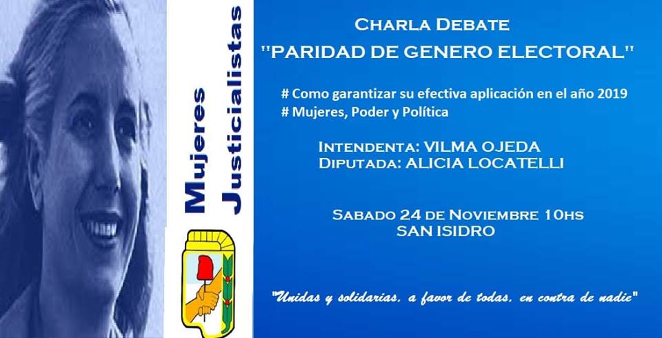 El día sábado a partir de las 10 AM mujeres peronistas se juntaran para debatir sobre el proyecto de paridad de género, como garantizar su efectiva aplicación en el año 2019, las mujeres, poder y política. Invita la intendenta municipal de San Isidro y la diputada provincial Alicia Locatelli, con el lema “Unidas y solidarias a favor de todas, en contra de nadie”