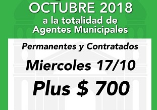 La secretaria de Hacienda y Economía comunica que este miércoles 17 de octubre, se abonará el plus de 700 pesos a todo el personal municipal hasta categoría 20 inclusive. El pago se realizará a través del sistema de cajeros automáticos.