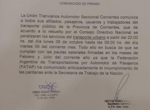 UTA Corrientes confirmó paro de colectivos desde esta noche a las 22