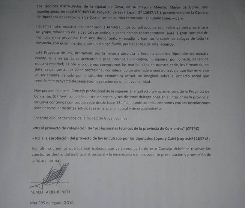 Los técnicos matriculados de la ciudad de Goya, en su mayoría Maestro Mayor de Obras, nos manifestamos en el RECHAZO al proyecto de ley (Expet. Nº 12637/18), presentado ante la Cámara de Diputados de la Provincia de Corrientes, en autoría caratulado: Diputados López – Calvi.
