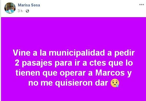 Marisa Sosa es una leona que como todas las mamas hace todo lo posible, para ver a sus hijos bien. Ella para operar a su hijo vendió comida, hicieron eventos solidarios y muchas cosas más. El viernes, tenía que conseguir pasajes para viajar a Corrientes y volver a operar a Marcos su hijo, pero la respuesta de la intendencia y de desarrollo humano a cargo de la Dra. Calvi, fue un no rotundo, sin siquiera preguntar como era de compleja la operación. Marisa público el rechazo en su cuenta de Facebook y ante la viralizacion a través de las redes sociales un delegado de veteranos de Huracán de nombre Ricardo, le resolvió el problema que debía resolverlo el estado. Pero el municipio decidió entregarle los pasajes luego que todos repudiaran la negativa de la misma.