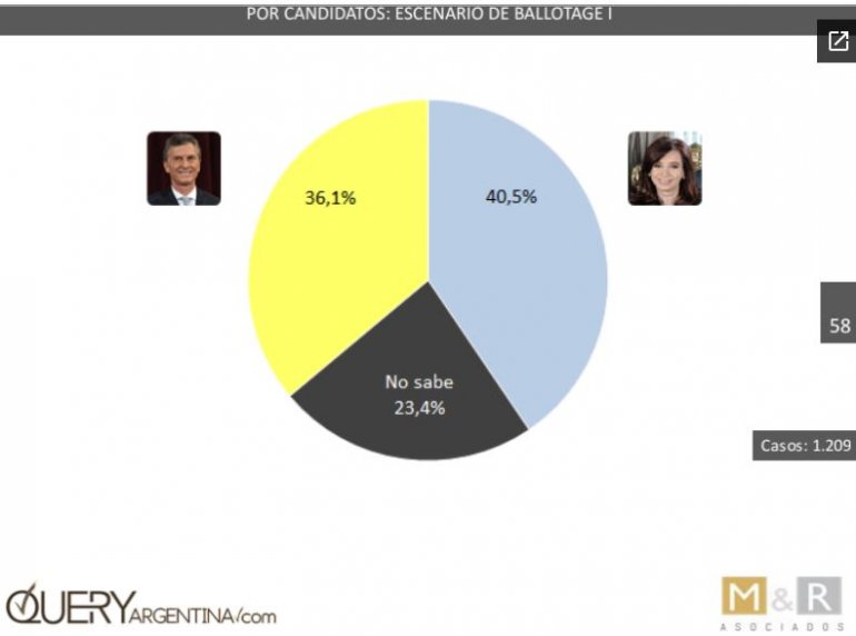Una encuesta de MyR Aasociados/Query Argentina muestra que si las elecciones fueran hoy la senadora de Unidad Ciudadana Cristina Kirchner se impondía en primera vuelta con el 30,5 por ciento de los votos, seguida por el Presidente Mauricio Macri con el 28,7 por ciento. En tercer lugar aparecería Sergio Massa con el 11,2 por ciento y en cuarto Nicolás Del Caño con el 5,9 por ciento.