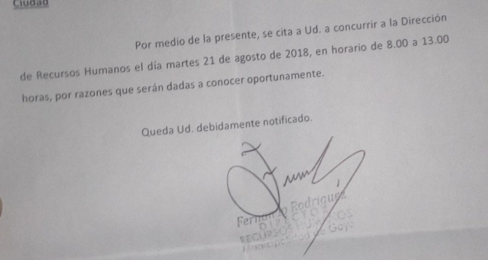 La gestión de Osella continua avasallando los derechos laborales, gracias al acompañamiento del poder judicial a través del juez Candas, quien hasta el momento no resuelve la cuestión de fondo, sobre empleados despedidos del municipio y que tenía como fecha para definir la situación el 30 de mayo. Hoy nuevamente trabajadores municipales fueron citados a la oficina de personal, donde los obligaron a renunciar a su derecho laboral más importante, la planta permanente.