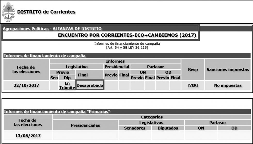 La Cámara Nacional Electoral desaprobó las cuentas de campaña de los principales candidatos de las elecciones legislativas del 22 de octubre de 2017. Los informes de financiamiento electoral de la alianza Encuentro por Corrientes (ECO) fueron rechazados -es posible- al considerar que no justificaron el origen y el destino de los millones invertidos en proselitismo.