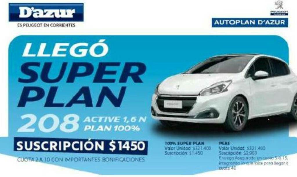 D'azur peugeot te da la posibilidad de tener tu 0 km, solo pagas $ 1.450 mas tu DNI y contá hasta 5. Bonificación el primer año, cuotas bajas y en pesos. No pierdas mas tiempo, si querés mas información envianos un SMS o un whatsapp al celular 3794728733 y un asesor se comunicara con vos.