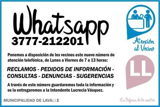 El Municipio de Lavalle lanzó su número de atención al vecino vía WhatsApp. El mismo será monitoreado por la Intendente Lucrecia Vásquez. La función de esta nueva vía de comunicación servirá para consultar sobre los pedidos realizados al municipio y que aún estén sin resolver o realizar nuevos pedidos, reclamos, información asesoramiento etc. La atención será de lunes a viernes 7 a 13 hs y se responderán solo mensajes de WhatsApp.
