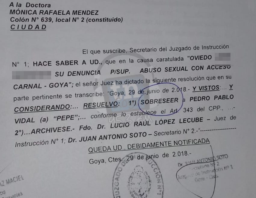 El Juez Lucio López Lecube, sobreseyó a Pablo Vidal, el empleado municipal que fue acusado del supuesto abuso a una menor el año pasado. A la supuesta víctima la hallaron frente al Asilo de Ancianos, San José y luego ella le confeso al padre quien sería el autor. El diciembre ya le declararon la falta de mérito. Ahora Vidal, queda desvinculado por completo del caso. Fue escrachado con fotos e investigadores habían declararon ante los medios como caso esclarecido, nombrándolo como el autor del hecho.