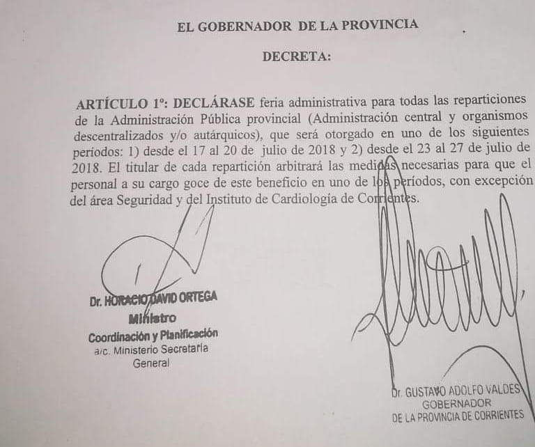 Gustavo Valdés firmó el decreto que fija la feria administrativa para los empleados de la administración pública provincial, la misma será del 17 al 20 y del 23 al 27 de julio. Cada jefe de área deberá coordinar con su personal a cargo el descanso en un turno y en uno de los períodos establecidos.