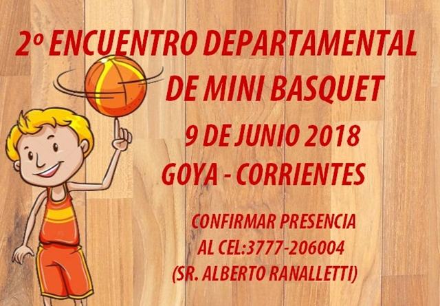 La Comisión Departamental de Mini básquet de la ciudad de Goya invita al cierre del 2º encuentro de Mini básquet, a realizarse en el Club Unión este sábado 9 de junio a partir de las 14:30 horas donde se realizará la concentración de delegaciones y luego entrada de Banderas de Ceremonias; seguidamente se entonará la canción patria.