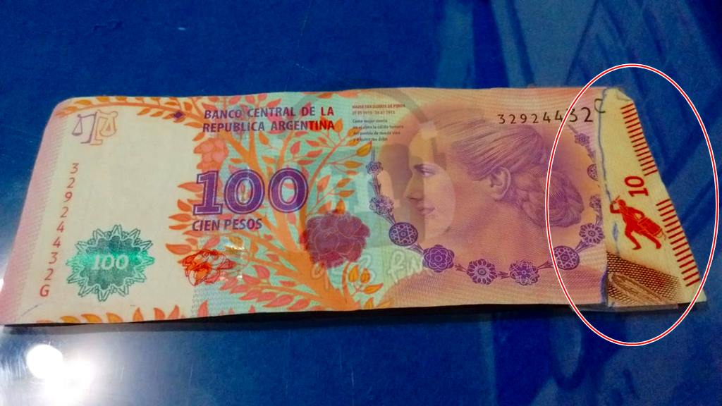 En la tarde del miércoles, ocurrió un llamativo caso, donde un agente federal extrajo dinero de un cajero automático del Banco Corrientes, sucursal Goya y entre los billetes de cien pesos, había uno remendado, “Cuando conté me percate que uno en la parte derecha tenía un remiendo de un billete de diez pesos”, conto a cronista de TNGoya. Imagen del billete.
