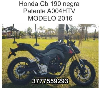 En la noche del lunes, se robaron esta (foto) motocicleta en B° Costa de las Rosas, y su dueño solicita ayuda para encontrar. Es una Honda CB 190 modelo 2016, patente A004 HTV. Cualquier dato se ruega comunicarse al 3777- 559293. La denuncia se radico en la comisaria segunda.