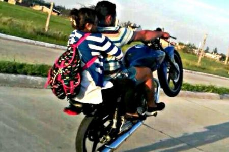 La docente de Nivel Primario de Educación vive en la ciudad de Santa Lucía pero da clases en Lavalle. Este viernes, padres de alumnos preocupados ante el ejemplo que da la misma, le fotografiaron sobre la moto, detrás de su hijo, sin casco y haciendo Wheelie.