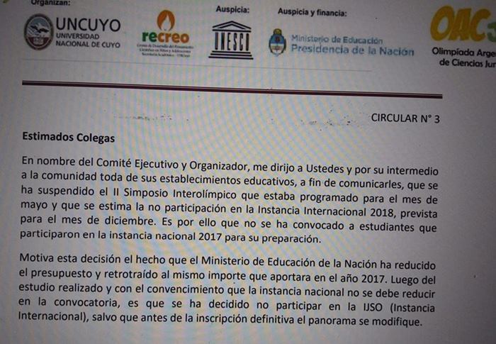 Docentes manifestaron su repudio ante la decisión del gobierno nacional en reducir presupuesto para las olimpiadas estudiantiles 2018, ante esa medida debieron suspender las instancias nacionales e internacionales. Quitándole la posibilidad a muchos jóvenes olímpicos que se incentivan año tras año en medir su aprendizaje con sus pares en distintas instancias.