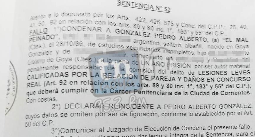 Como estaba previsto, ayer miércoles hubo debate en Juzgado Correccional 3 de Goya, donde se condenó a un hombre de apellido González, por golpear con un palo a su ex pareja en agosto de año pasado. La pena es de UN AÑO DE CUMPLIMIENTO EFECTIVO, que deberá cumplir en una cárcel en Corrientes, y además se lo declara reincidente. La víctima, ayer dialogó con cronista de este medio y dijo mostrarse confiada por la justicia.