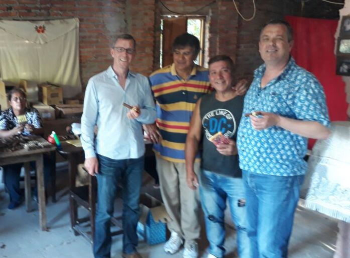 El taller de puros "Don Goyo" de Héctor Pintos recibió este martes a empresarios alemanes quienes buscan oportunidades para invertir en Corrientes. Recibidos por “Charly” Fernández y Lorena de Carlo, los empresarios Helge Heyd y Karsten Roloff aprendieron sobre la producción artesanal de cigarros y puros en Corrientes.