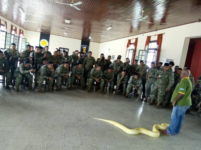 El día viernes a la mañana se realizó una jornada en el batallón de Monte 12, donde el titular del Serpentario Municipal, Juan Carlos Peña, brindó una exposición, demostración y charla sobre ofidios y animales ponzoñosos: conocimientos y mordeduras de víboras, arañas y alacranes, para los efectivos de la companía. En la ocasión se le hizo entrega de un diploma por su colaboración hacia la Fuerza Armada. Más de 60 soldados, oficialidad y personal de cuadro se capacitaron en esta importante temática.