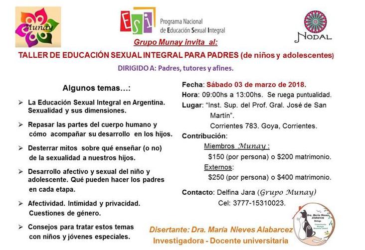 Este sábado 3 de marzo a las de 09 AM comenzara la jornada de capacitación convocada por el grupo Munay sobre educación sexual integral. Algunos de los temas centrales serán, la educación sexual integral en Argentina, sexualidad y dimensiones, repasar las parte del cuerpo humano y como acompañar el desarrollo de los hijos, desterrar mitos sobre que enseñar o no de la sexualidad de los hijos, el desarrollo afectivo y sexual del niño y adolescente, ¿que pueden hacer los padres en cada etapa?. El lugar será en el Instituto San Martin, por calle Corrientes 783. Contribución $150 por persona o 200 el matrimonio, externos $250 por persona y 400 por matrimonio. Contacto Delfina Jara cel. 377715310023.
