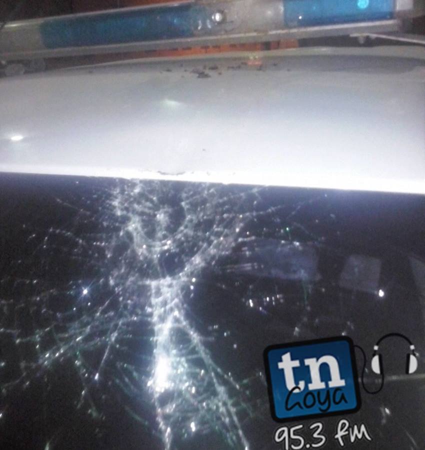 Parabrisas de un patrullero de comisaria Quinta de #Goya, quedo destruido, ocurrió en madrugada de ayer, le arrojaron una botella cuando cruzaba frente asentamiento el Chacal. Hubo persecución, pero no hay detenidos.