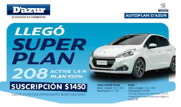 Pueugeot se relanza con la cuota más baja del mercado para que lleges a tu nuevo 0 Km, con cuotas desde $ 1450, suscripción y armado de carpetas gratis. Si querés más información, envía un SMS o un Whatsapp al 3794-728733 y un asesor se comunicará con vos.