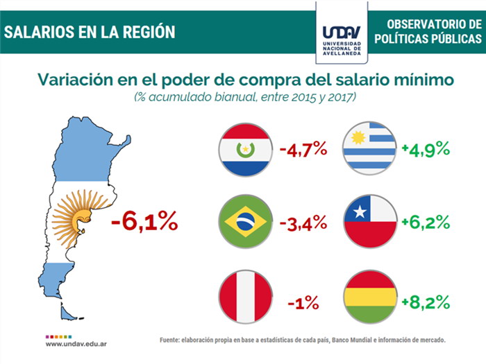 Argentina es el país de la región con mayor deterioro del poder adquisitivo del salario mínimo (acumula una caída de 6,1% en los últimos dos años), según un informe de la Universidad de Avellaneda (Undav).
