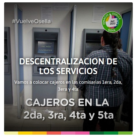El municipio hizo un anuncio de recorridas del cajero móvil como que se habrían realizado gestiones en conjunto con el Banco de Corrientes para implementar el cajero móvil en distintos sectores del Departamento Goya. Lo cierto es que el cajero móvil viene haciendo lo mismo hace varios año y la respuesta que todos los vecinos esperan es el cumplimiento de la palabra de Osella quien en campaña dijo que iba a colocar cajeros automáticos en todos las comisarias, en su página web de campaña “Vuelveosella”, dice textualmente; descentralización de los servicios, cajeros automáticos en las comisarías, 2da, 3ra, 4ta, y 5ta.