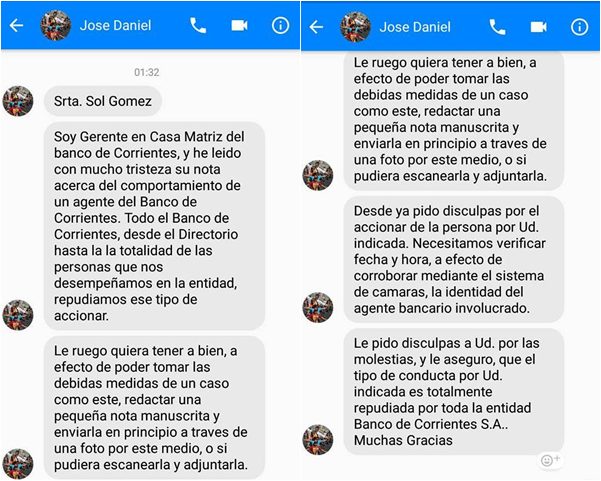 Una joven denuncio en su cuenta de facebook al Gerente del banco de Corrientes de haber sacado a las patadas a un perro que se encontraba durmiendo dentro del sector de cajeros automáticos y que ante la queja de un señor del por qué hacia eso con el perrito, el Gerente de una manera muy arrogante y prepotente le hizo saber al señor que él iba hacer lo que le fuera en gana. Ante esta publicación el gerente de casa matriz de la entidad bancaria se comunico con la joven, a quien aseguro tomar medidas y ver las cámaras de seguridad. Cabe destacar que no es la primera vez que el gerente local tiene reacciones altaneras.