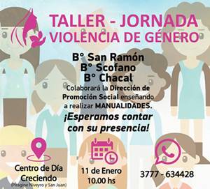 La Dirección de la Mujer, dependiente de la Secretaría de Desarrollo Humano y Promoción Social, organiza para el día jueves 11 de enero, desde las 10:00 hs, una jornada taller con la finalidad de concientizar sobre la problemática actual de violencia de género.