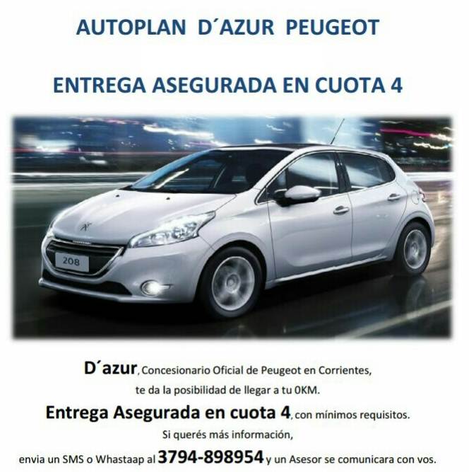 DAZUR concesionario Oficial de Peugeot en Corrientes, te da la posibilidad de llegar a tu 0km, entrega asegurada en la cuota 4, con mínimos requisitos. Si querés mas información, envía un SMS o un Whatsapp al 3794-898954 y un asesor se comunicará con vos.