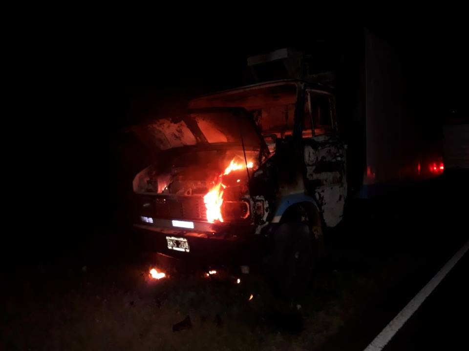 Así ardió anoche un camión de transporte alimenticio de la empresa Sancor Goya, sobre Ruta 27 en Desmochado. El conductor fue identificado como Mendoza José, de 60 años de edad, resultó ileso y el vehículo quedo consumido por las llamas, el foco ígneo se habría originado por desperfecto en la parte eléctrica.