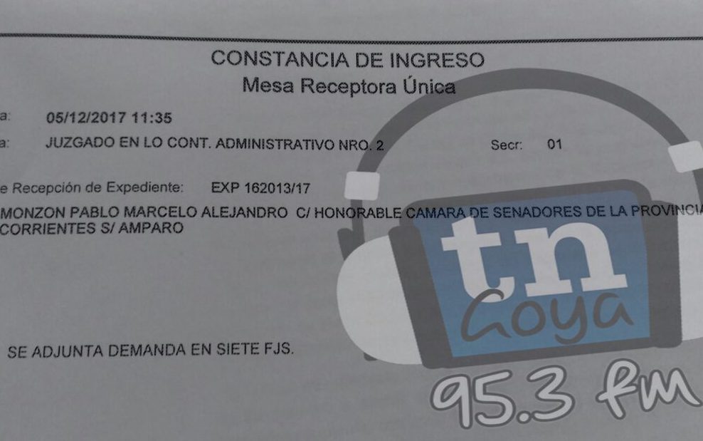 El doctor Pablo Monzón, concejal de Goya, interpuso una acción de amparo, ante el Juzgado en lo Contencioso Administrativo N° 2 de la ciudad de Corrientes, para que el Senado de la Provincia lo convoque a jurar como senador provincial. “Sólo reclamo la banca que me corresponde como Senador electo de la provincia, estoy convencido que el fallo va a ser favorable, cuando un senador fallece o renuncia se envía la lista del senador suplente que sigue y ése soy yo” remarcó.”No tiene plazos, pero no debería tardar demasiado” sostuvo.