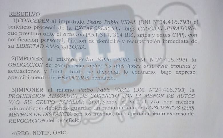 Pasada las 10 Hs fue notificado por el juez Lucio Lopez Lecube la excarcelación a Pablo Vidal, tiene restricción de acercamiento de 200 metros, y no podrá tener ningún tipo de contacto con menor y familia, además deberá comparecer cada lunes al Juzgado. Ahora deberá seguir la investigación sobre el abuso, sobre las pistas que relacionan a otras personas.